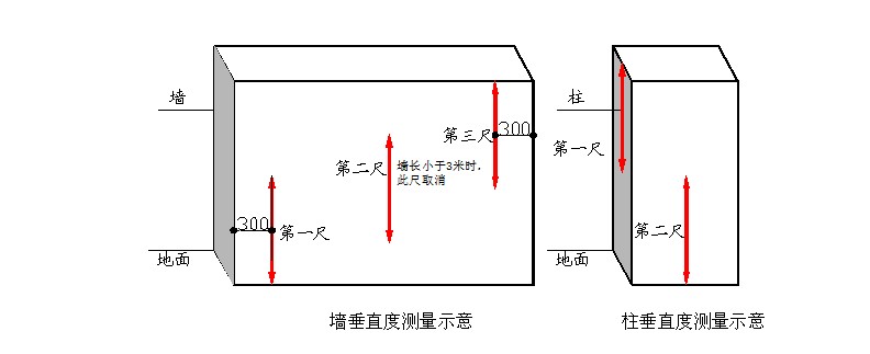 ●當(dāng)墻面長(zhǎng)度大于3米時(shí),還需在墻長(zhǎng)度中間位置增加1次水平測(cè)量,3次測(cè)量值均作為判斷該實(shí)測(cè)指標(biāo)合格率的3個(gè)計(jì)算點(diǎn)。
