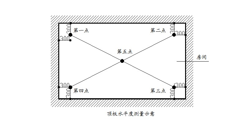(1)指標(biāo)說(shuō)明:考慮實(shí)際測(cè)量的可操作性,選取同一功能房間砼頂板內(nèi)四個(gè)角點(diǎn)和一個(gè)中點(diǎn)距離同一水平基準(zhǔn)線之間5個(gè)實(shí)測(cè)值的極差值,綜合反映同一房間砼頂板的平整程度。