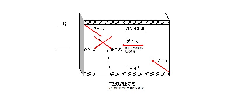 ●墻面有門(mén)窗、過(guò)道洞口的,在各洞口45度斜交測(cè)一次,作為新增實(shí)測(cè)指標(biāo)合格率的1個(gè)計(jì)算點(diǎn)。