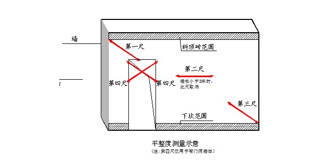 ●當(dāng)所選墻長(zhǎng)度大于3米時(shí),除按45度角斜放靠尺測(cè)量?jī)纱伪砻嫫秸韧?,還需在墻長(zhǎng)度中間水平放靠尺測(cè)量1次表面平整度??缍纯诓课槐販y(cè)。這3個(gè)實(shí)測(cè)值分別作為判斷該指標(biāo)合格率的3個(gè)計(jì)算點(diǎn)。